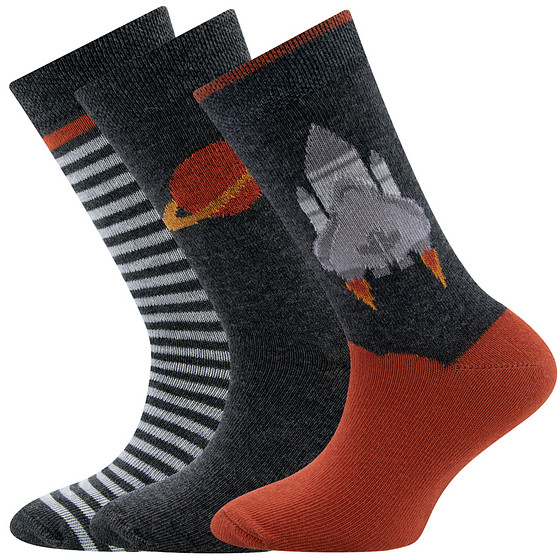 3-Pack Kindersokken Ewers Jongens - Set - Donkergrijs met Spaceshuttle & Grijze Streepjes & Donkergrijs met Saturnus/Planeet