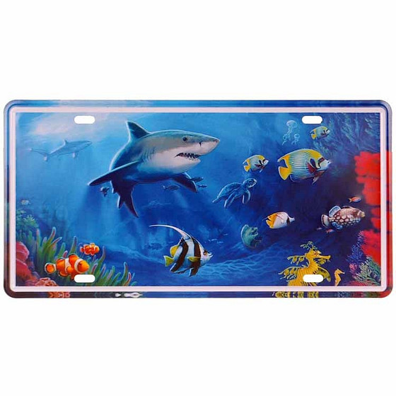 Metalen plaat met afbeeldingen van een haai en vissen. Leuk om in je keuken op te hangen, in een barretje of in de kantine. Maar ook om je veranda of mancave aan te kleden.