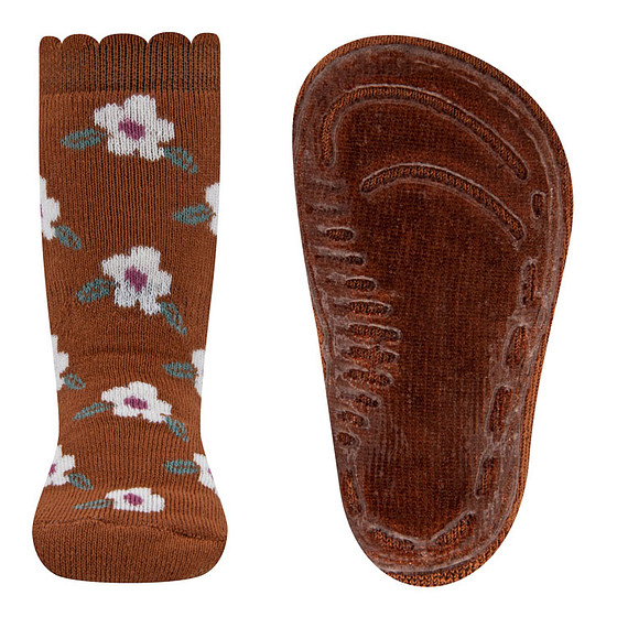 Antislipsok Ewers - Lichtbruin - Bloemen Wit/Groen - Bewerkte Rand - Siliconenzool