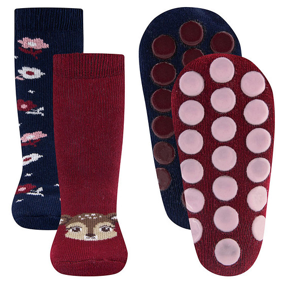 Antislipsokken Ewers Kindermaat - DUOPACK - Donkerblauw & Wijnrood met Hertje en Bloemen - Siliconen Noppen