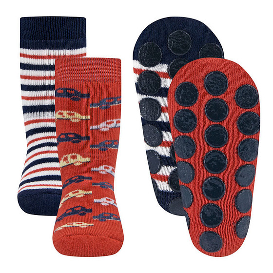 Antislipsokken Ewers Jongens - Set 2-Pack -Oranjerood met Autos & Strepen - Elastisch - Noppenzool