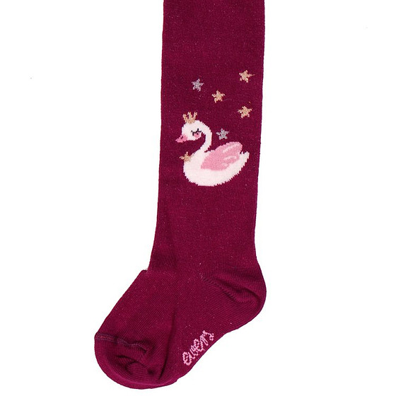 De wijnrode kleur geeft de maillot een feestelijke uitstraling. Op de buitenkant van beide enkels staat een sierlijke zwaan. De kroon van de zwaan en de sterretjes er omheen zijn gemaakt van gouden en zilveren glittergaren.