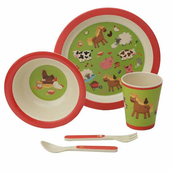 Leuk kinderservies van bamboe met afbeeldingen van boerderijdieren.