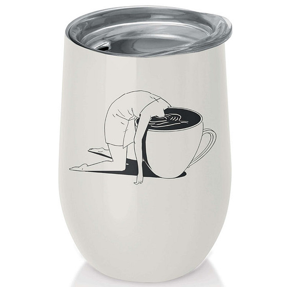 Op de milieuvriendelijke kantoorbeker van het merk chic.mic staat een afbeelding van een vrouw die haar hoofd heeft ondergedompeld in een kop koffie.