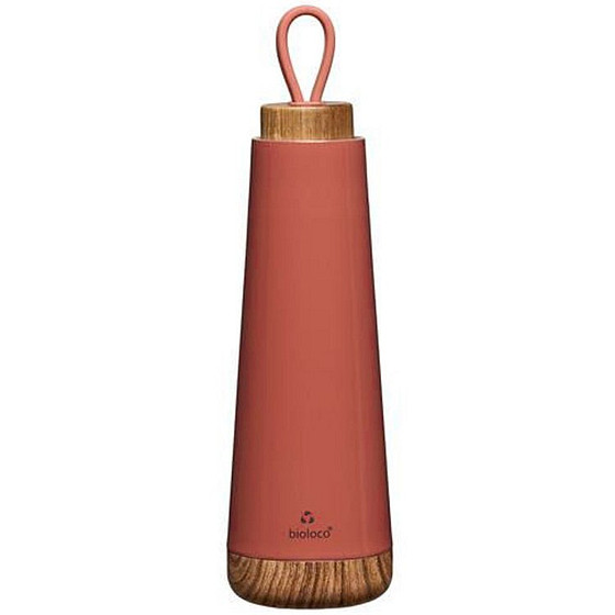 Bioloco drinkfles/thermosfles in de kleur koraal, afgewerkt met een houten dop en een houten onderkant.