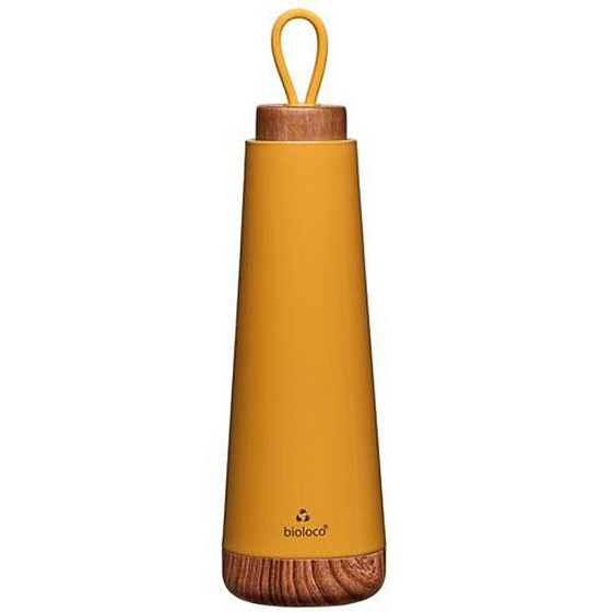 Bioloco drinkfles/thermosfles in de kleur mosterdgeel, afgewerkt met een houten dop en een houten onderkant.