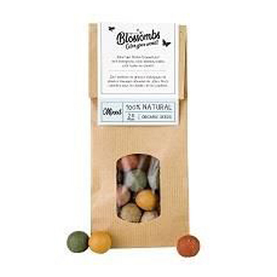 Blossombs zijn kleurrijke bloem 'bommetjes' gemaakt in Nederland met 100% natuurlijke ingrediënten en een biologische - speciaal voor bijen en vlinders - samengestelde zadenmix van wilde bloemen.
