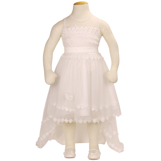 Deze stralende jurk heeft een transparant lijfje en broderie van bloemetjes en pareltjes.