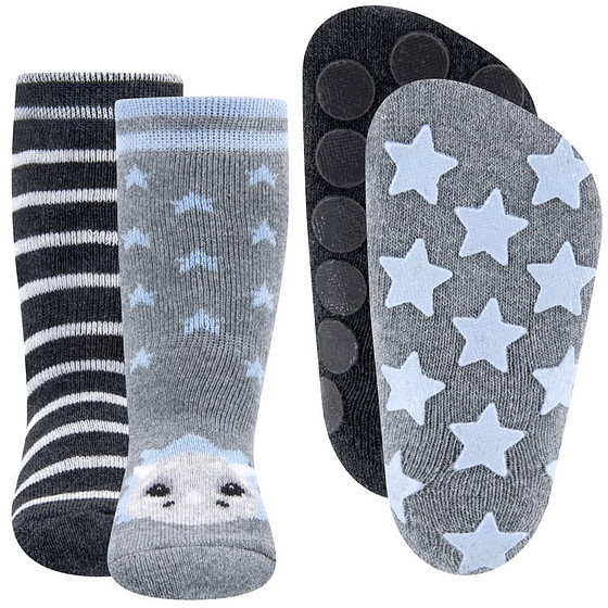 Een duopack met een donker paar en een licht paar sokken. De donkere sokken zijn donkergrijs/lichtgrijs gestreept met een antslip zool in de vorm van rondjes. De lichte sokken hebben het hoofd van een dinosaurus, sterren en de antislip zool is in de vorm van sterren.