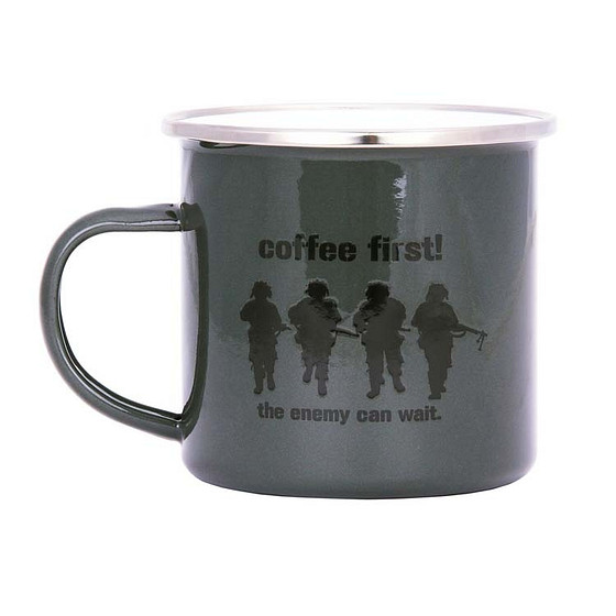 Op de beker staat de tekst 'Coffee First' en 'The enemy can wait'.