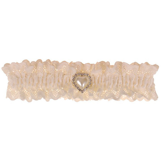 Een prachtige ivoorkleurige kousenband in een grote maat. Op de kousenband zit een pareltje in de vorm van een hartje met daaromheen kleine strasssteentjes.