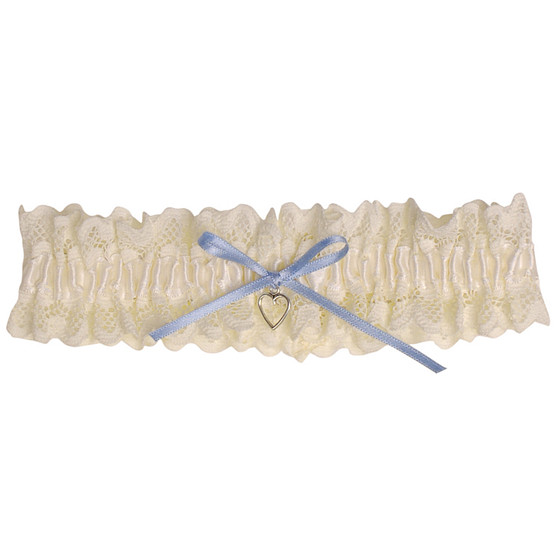 Grote maat Kousenband Ivoorkleurig Broderie - blauw strikje en zilverkleurig hartje