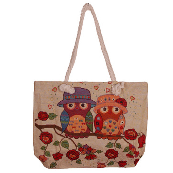 Grote Schoudertas - Uilen op Tak met Mutsen - Hartjes en Rozen - Ecru - Geborduurd - 45x33cm
