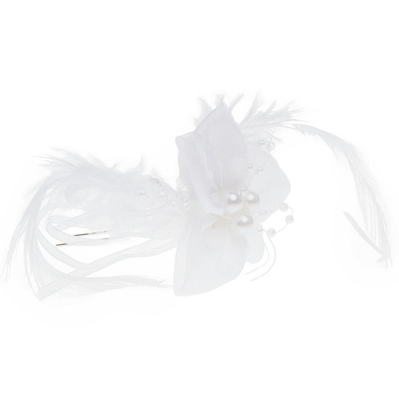 zilvere haarsteker rijkelijk bewerkt met een witte bloem. Onder de witte bloem zitten kleine witte veertjes. In het hart van de bloem zit een versiersel met pareltjes.