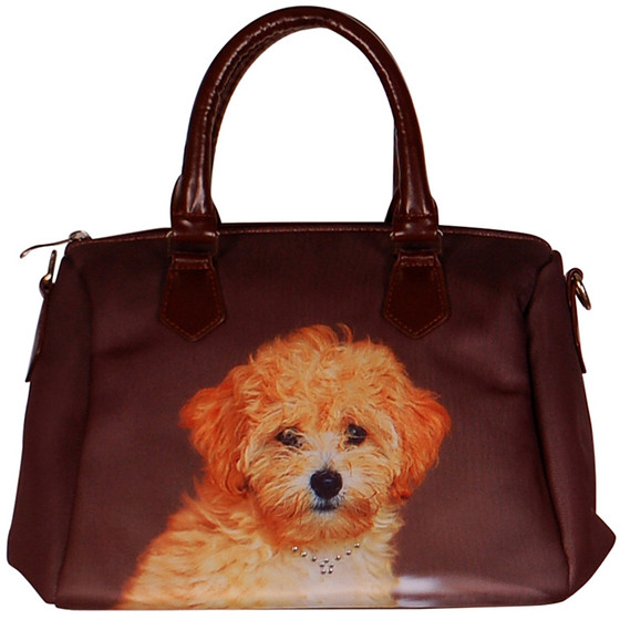 Verder is deze schoudertas met hondje met bruine accenten afgewerkt en loopt in de breedte (zijkant) taps naar boven toe.