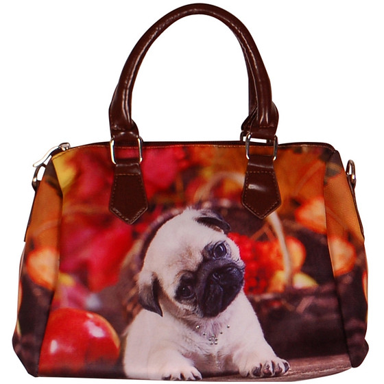 Verder is deze schoudertas met hondje met bruine accenten afgewerkt en loopt in de breedte (zijkant) taps naar boven toe.
