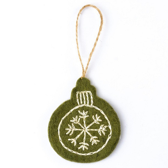 Hanger Vilt - Kerstbal Geborduurd Motief - Mistletoe - 8cm - Groen/Wit - Vlak - Fairtrade