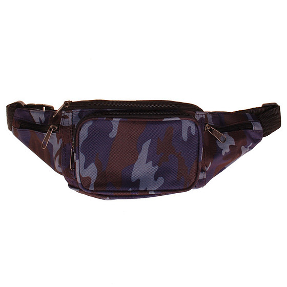 Deze tas is blauw/bruin gevlekt en heeft een zwarte verstelbare heupband die sluit met een kunststof inschuifsluiting. De heuptas van camouflagestof heeft 5 vakken met stevige ritsen.