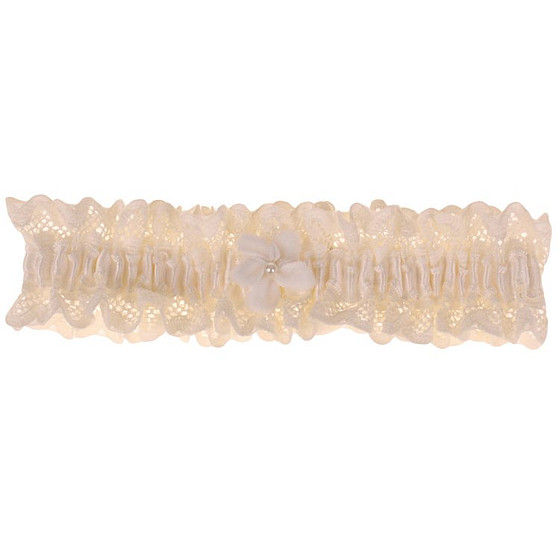 Een prachtige kousenband met een schattig bloemetje met een klein pareltje in het midden. De kleur van de band is ivoor.