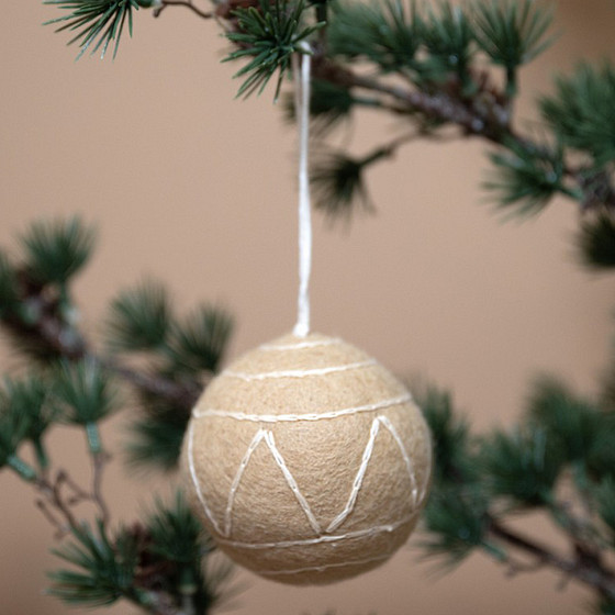Kerstbal Vilt - Gingerbread Large - Geborduurde Lijnen - 8cm - Beige/Wit - Rond - Fairtrade