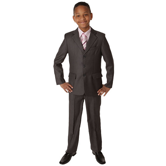 Op de foto gecombineerd met een roze kinderoverhemd, roze gestreepte kinderstropdas en zwarte schoenen.