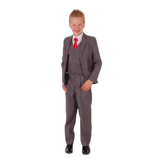 Dit donkergrijze kinderkostuum is 3-delig en bestaat uit een broek, een gevoerd jasje en een gevoerd gilet.