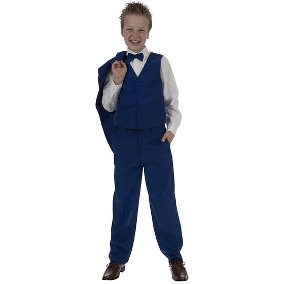 Op de foto is het koningsblauwe jongenskostuum gecombineerd met een kinderoverhemd, kinderstropdas en nette schoenen.