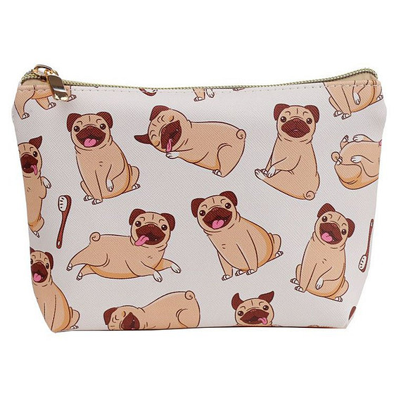 Klein toilettasje met daarop verschillende afbeeldingen van een Mopshondje.