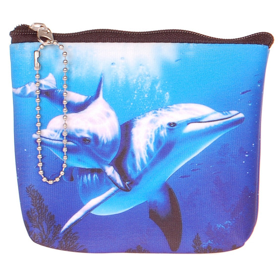 Op het portemonneetje staat een afbeelding van 2 dolfijnen.