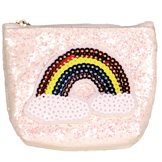 Op het glitter portemonneetje staat een afbeelding van een regenboog.