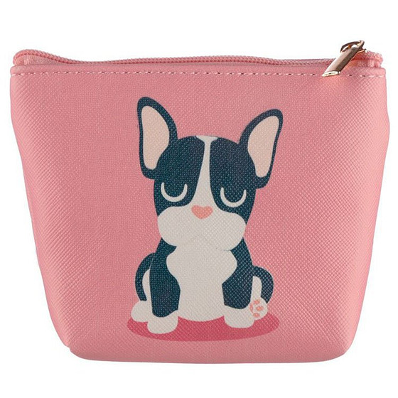 Klein lichtroze portemonneetje met een ritsje. Op het portemonneetje staat een afbeelding van een hondje. Dit handzame buideltje is uitermate geschikt voor wat kleingeld, sleutels, pilletjes, etc.