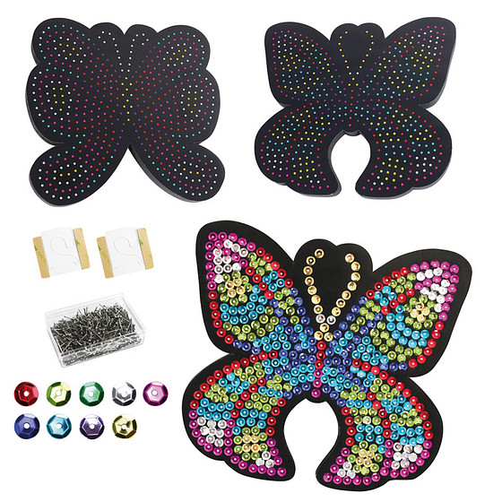 Zeer uitgebreide set waarbij pailletten op een schuimrubber ondergrond geprikt kunnen worden door middel van kleine pinnetjes. Op het schuimrubber staat het voorbeeld met de juiste kleuren aangegeven. Prik de pinnetjes met pailletten op de juiste plek en zie een prachtige afbeelding verschijnen! Deze set komt in een mooi gepresenteerde giftbox. Deze creatieve set bevorderd de oog-hand coordinatie bij het kind en het zien van verschillende kleuren en vormen.