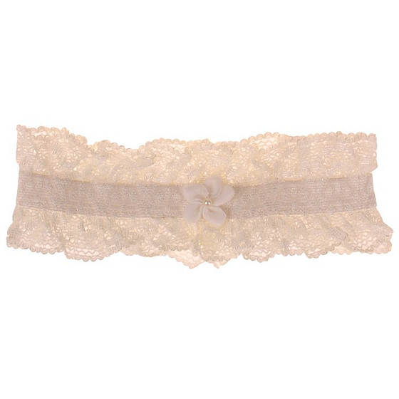 Een mooie ivoorkleurige kousenband met daarop een lief klein bloemetje met daarin een klein pareltje.