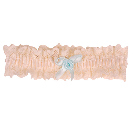 Kousenband Bruid Ivoorkleurig met Broderie & Lichtblauw Strikje met Roosje - 33cm Elastisch