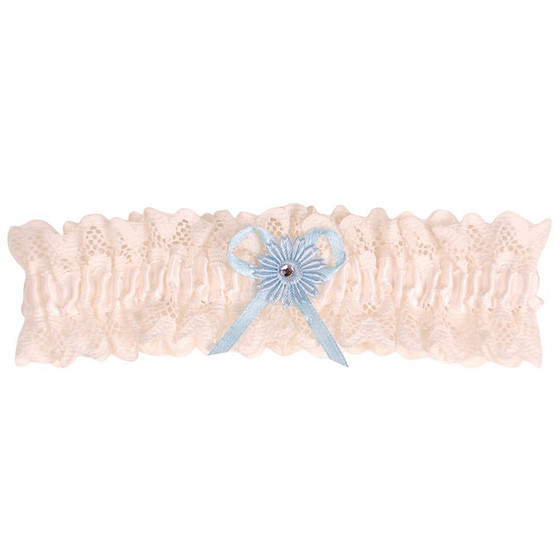 De band is gemaakt van ivoor elastisch kant met een blauw bloemetje en strass.