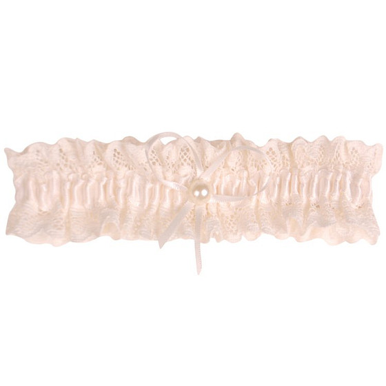 De band is gemaakt van ivoorkleurig elastisch kant met een strikje en pareltje.