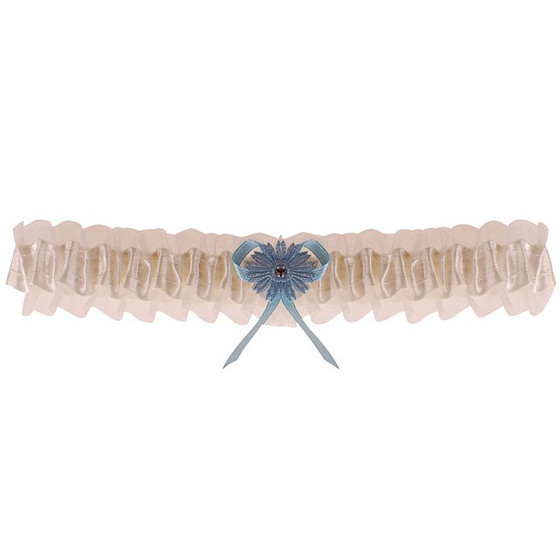 Kousenband grote maat - ivoor met blauw bloemetje en strass