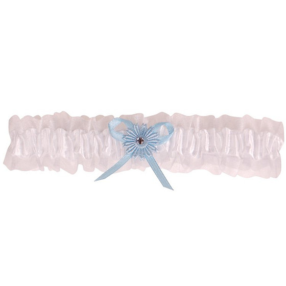 De band is gemaakt van wit elastisch kant met een blauwbloemtje en een strass steentje.