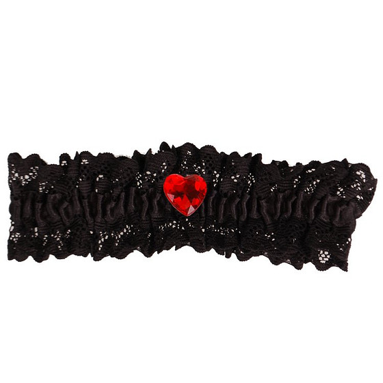 De band is gemaakt van zwart elastisch kant en bezet met een rood strass steentje in de vorm van een hartje.