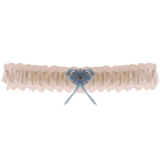 Kousenband ivoor met blauw bloemetje en strass