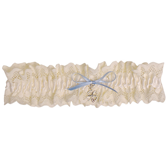 Kousenband Ivoorkleurig Broderie - blauw strikje en zilverkleurig klavertje