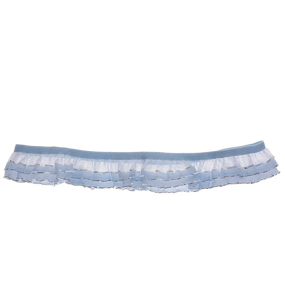 Smalle lichtblauwe kousenband met organza en zilverdraad.