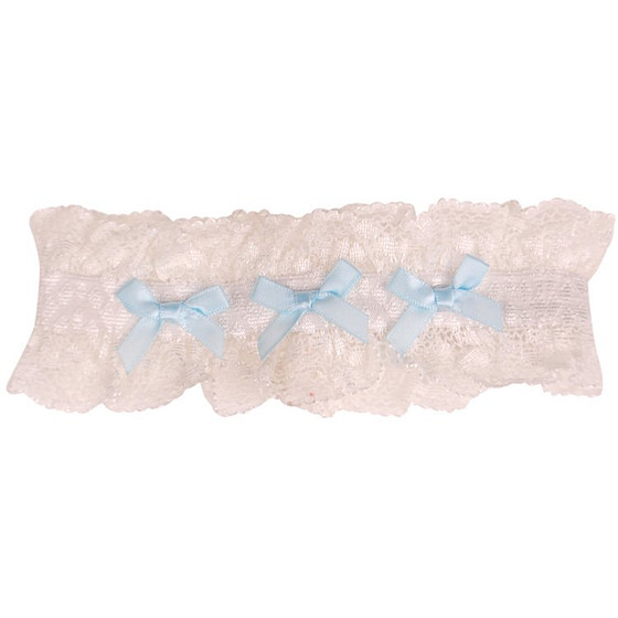 De band is gemaakt van ivoorkleurig elastisch kant met blauwe strikjes.