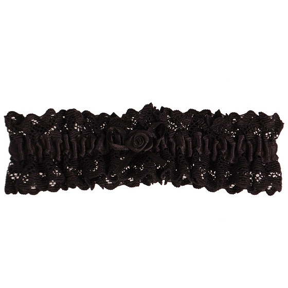 De band is gemaakt van zwart elastisch kant, het bandje in bezet met een strikje en een roosje.