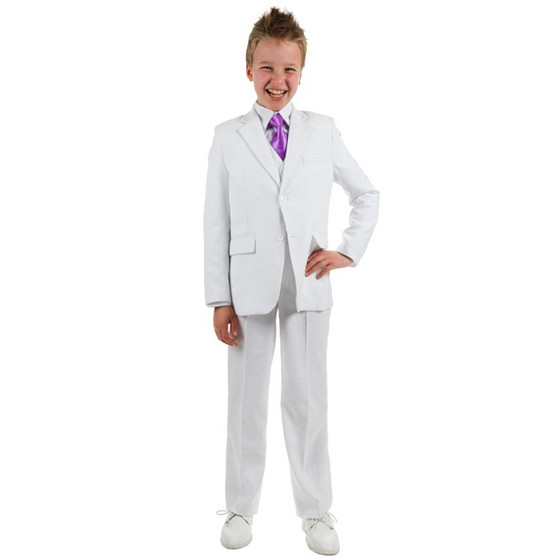 Voor een bruidsjonker, maar alleen als de kleur van de bruid of bruidegom ook wit is. Als de kleur van een van beide ivoor is, koop dan geen wit jongens kostuum! Dan is het namelijk net alsof de jurk of het kostuum van de bruid of bruidegom een beetje smoezelig is.
