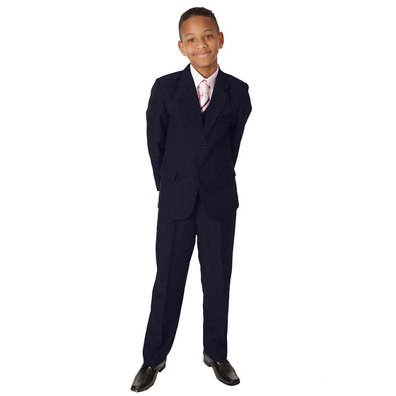 Luxe 3-delig donkerblauw kinderkostuum van een mooie en zware kwaliteit stof. Het kostuum bestaat uit een jasje, gilet en broek. Op de foto gecombineerd met een kinderoverhemd, kinderstropdas en nette schoenen.