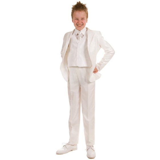Luxe 3-delig ivoorkleurig kinderkostuum van een mooie licht glimmende stof.