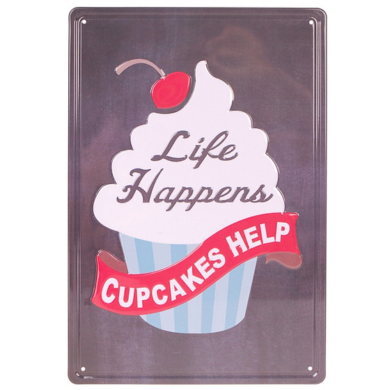 Op het bordje staat een cupcake afgebeeld met de tekst; Life happens, cupcakes help.