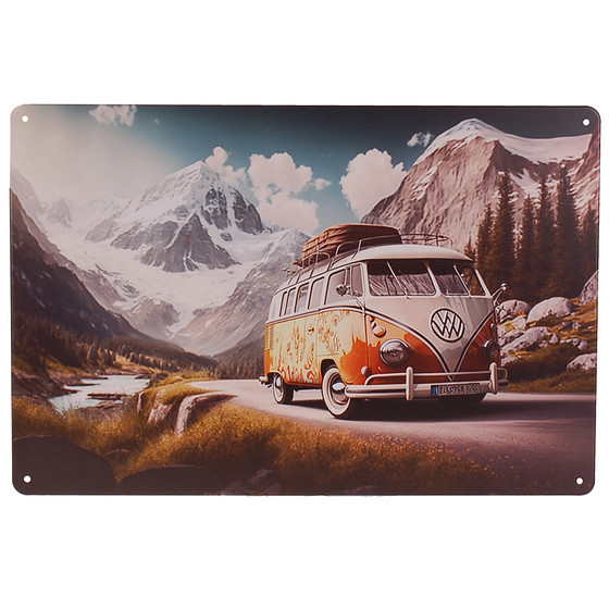 Metalen Plaatje - Retro Camper Oranje op Bergweg - 20x30cm