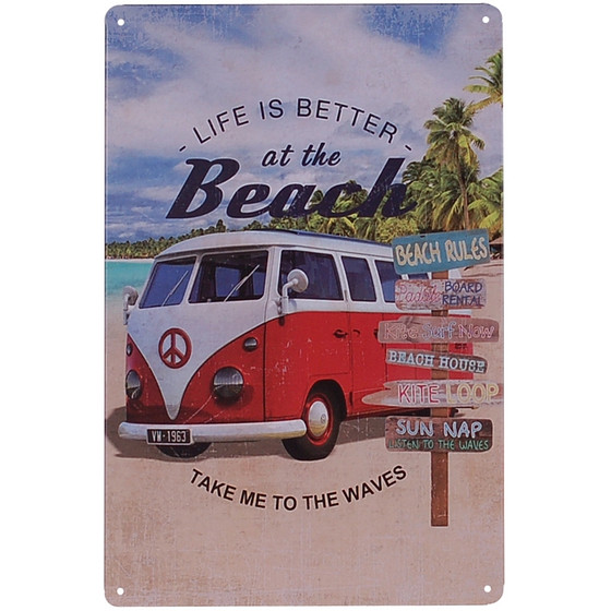 Metalen plaat met een afbeelding van een rood Volkswagenbusje op het strand.